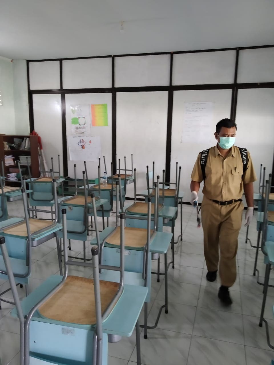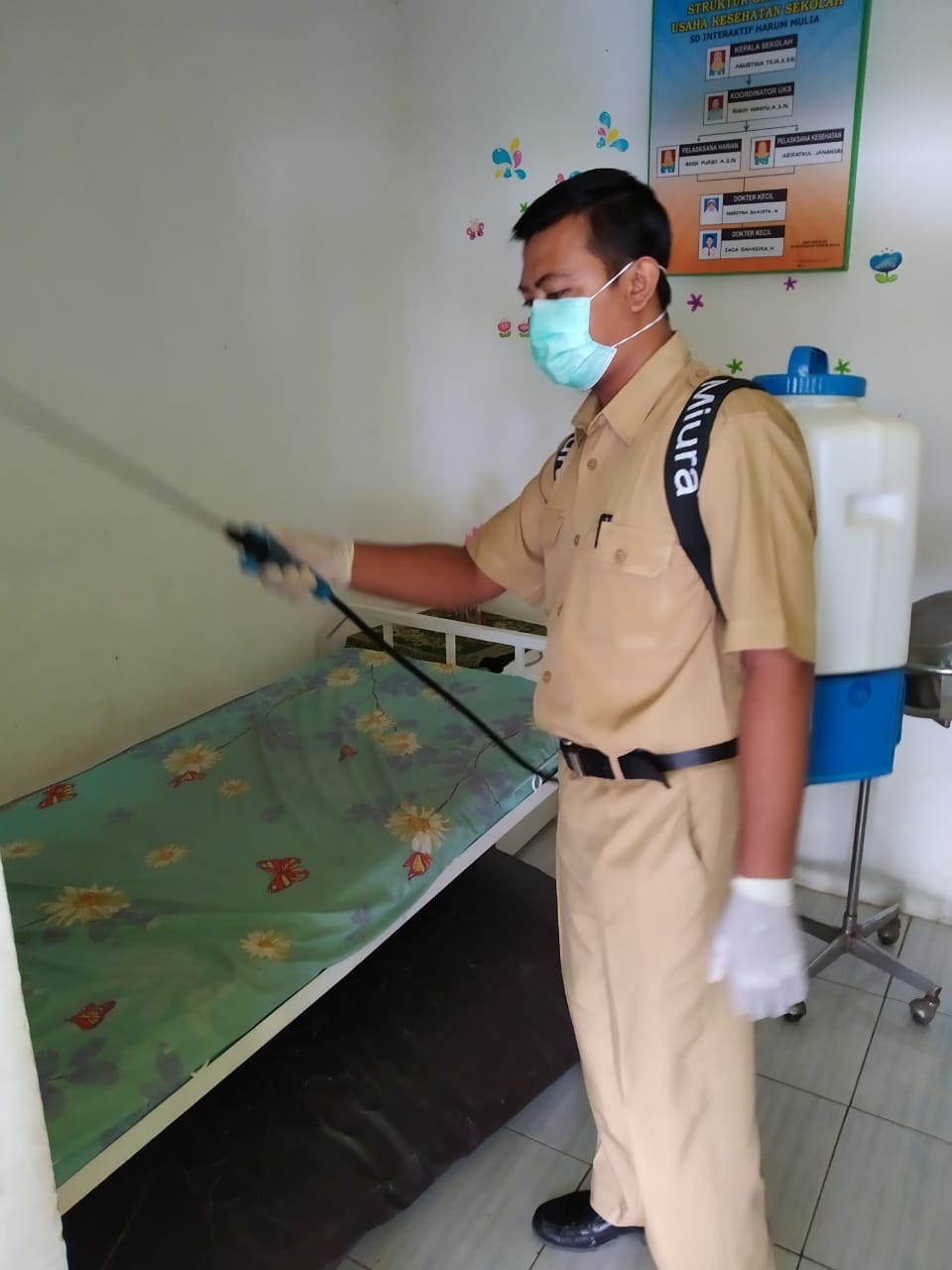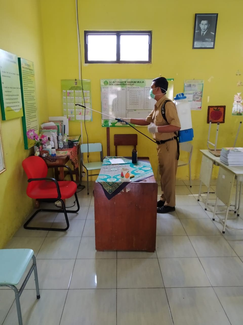 Senin (23/03/20) Kegiatan pembersihan ruangan dan lingkungan kegiatan belajar mengajar dengan cairan disinfektan oleh guru-guru SD Interaktif Harum Mulia.